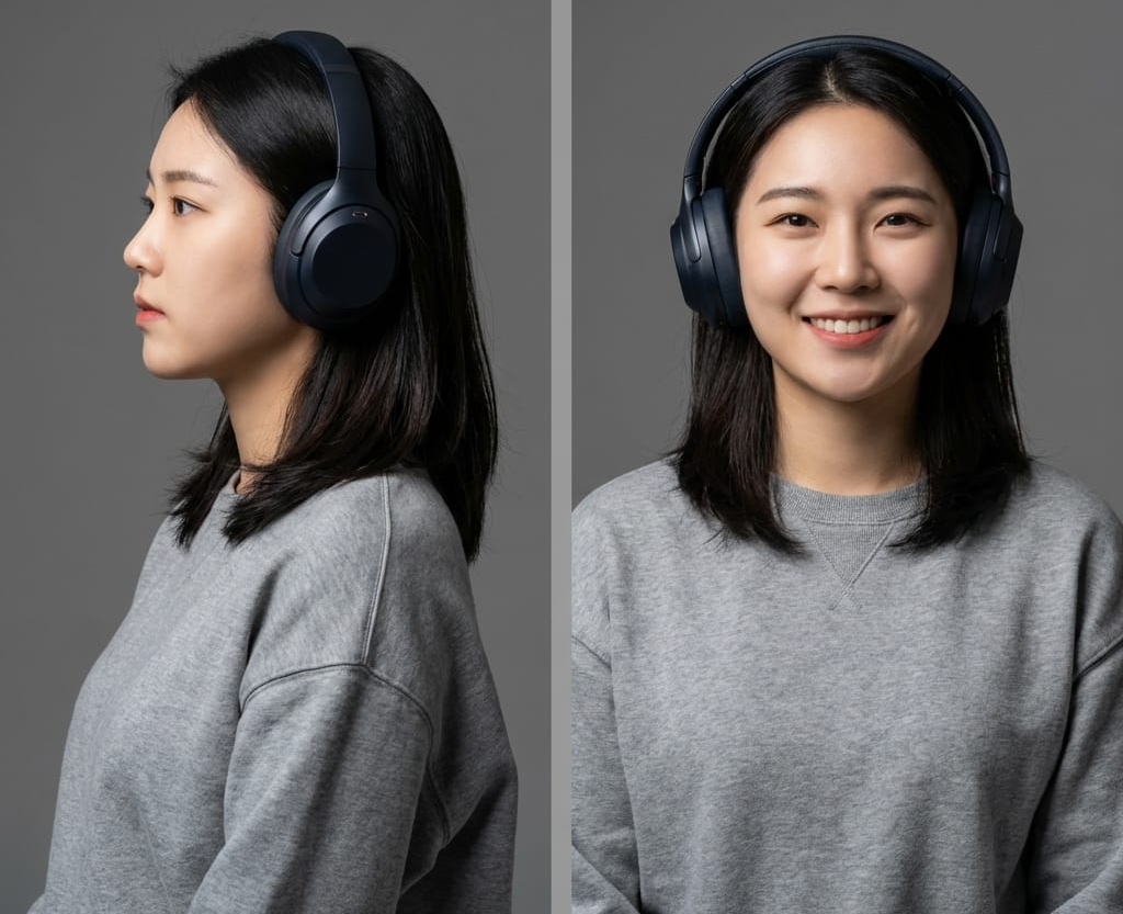 하면, AI가 측면 사진을 분석해서 자연스러운 정면 샷을 생성해줍니다. 헤드폰을 낀 옆모습 사진 한 장만 있으면, 정면 샷, 45도 얼짱 각도 샷을 무한대로 만들어낼 수 있어요.
